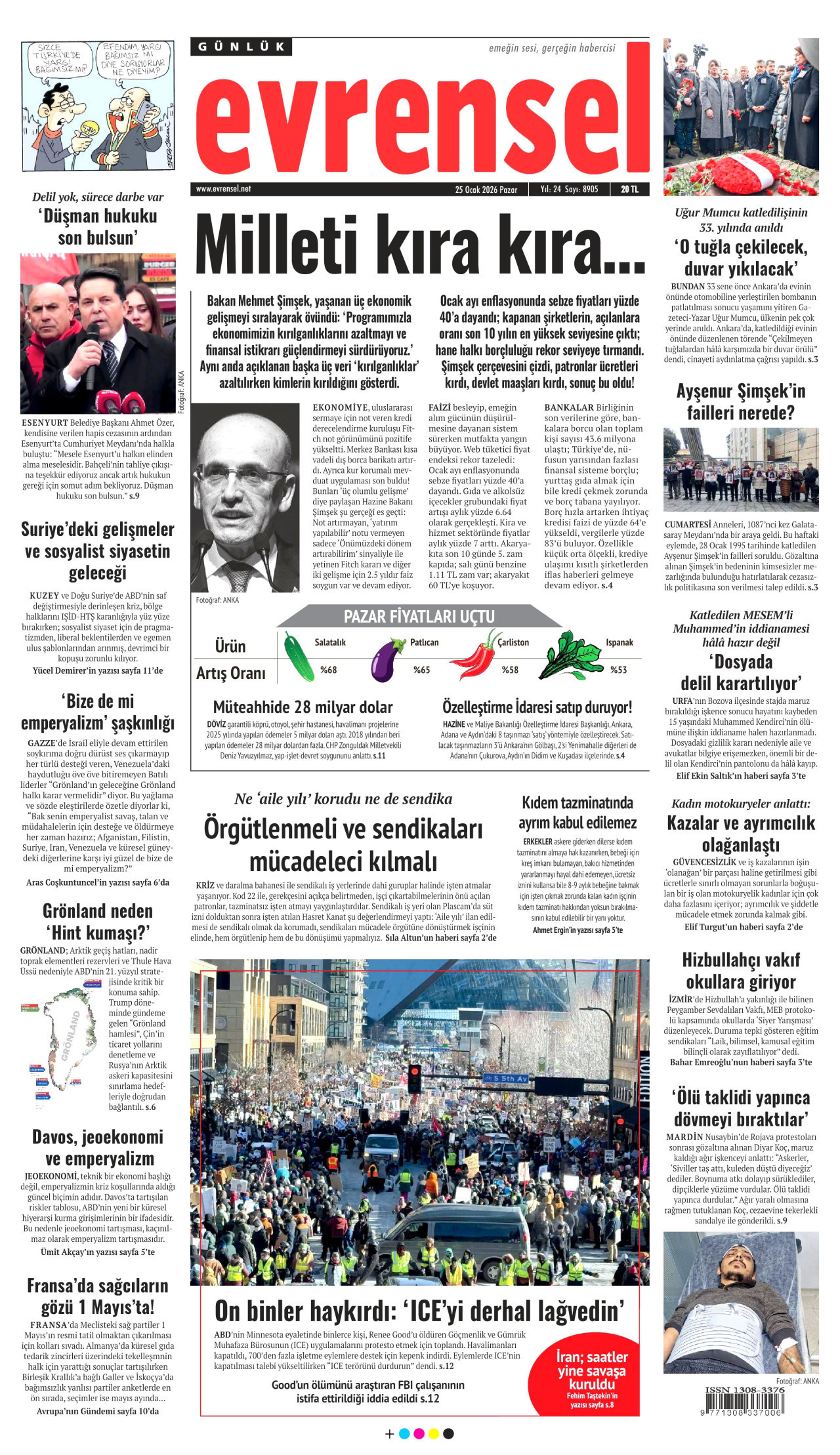 EVRENSEL Gazetesi 25 Ocak 2026, Pazar Günü Manşeti