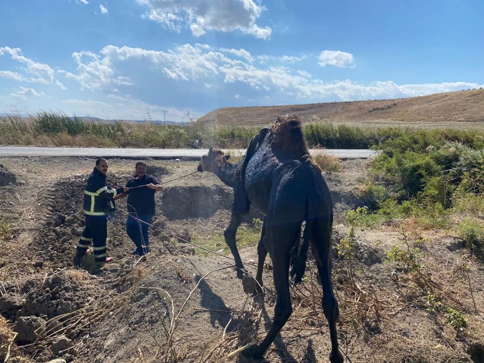 Antakya Yeşilova’da su kanalına düşen deve, itfaiye ekiplerince kurtarıldı.